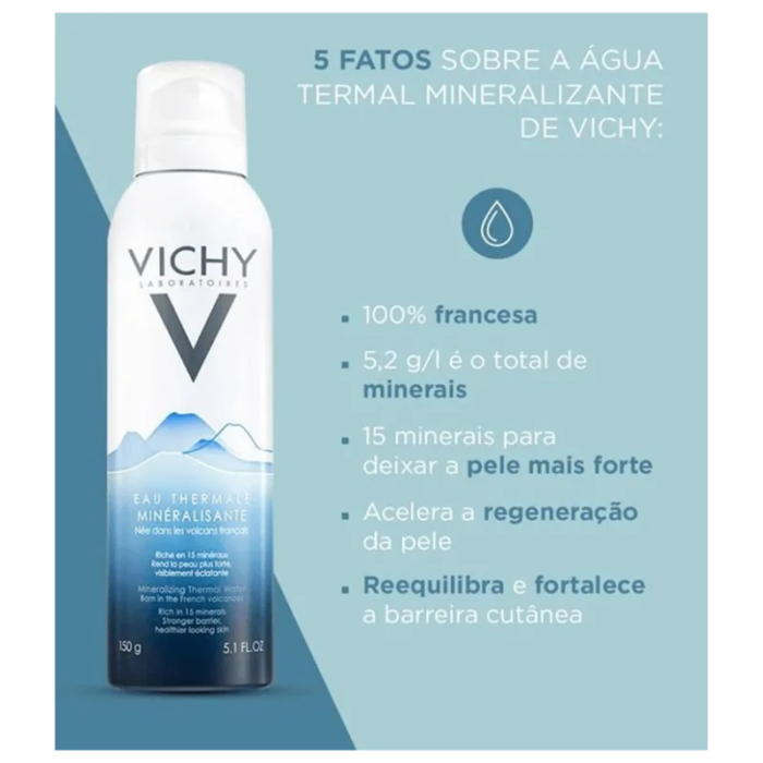 A Água Mineralizante Termal de Vichy é um milagre da natureza, naturalmente rico em 15 minerais regenerantes + antioxidantes, essenciais para a saúde da pele. Tão único que não pode ser reproduzido pela ciência. Tão poderoso que pode restaurar a saúde da sua pele.